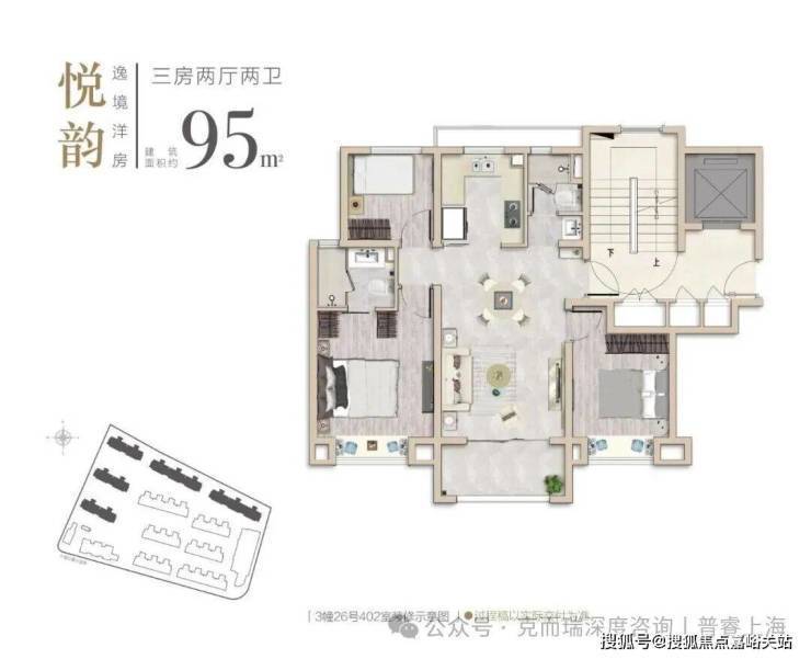 户型设计中规中矩,优缺点分明。优点包括:洋房一梯两户,得房率能达到80%。95㎡三房是经典的飞机户型,做到了南北通透、三开间朝南。