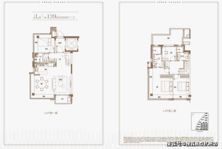 建面约139㎡上叠户型,三层是会客区,四层是居住区,阳台+露台+多个飘窗设计,附加空间非常大,在别墅类产品中实属罕见!