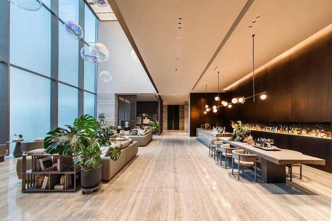 同时,部分采用天青色釉面陶板,超扁平形制,同样搭配大面幅落地Low-e三玻两腔玻璃,让建筑像是妙手剪裁的艺术品般行云流水,更大程度的为业主带来宽绰视野,体验摩登生活。
