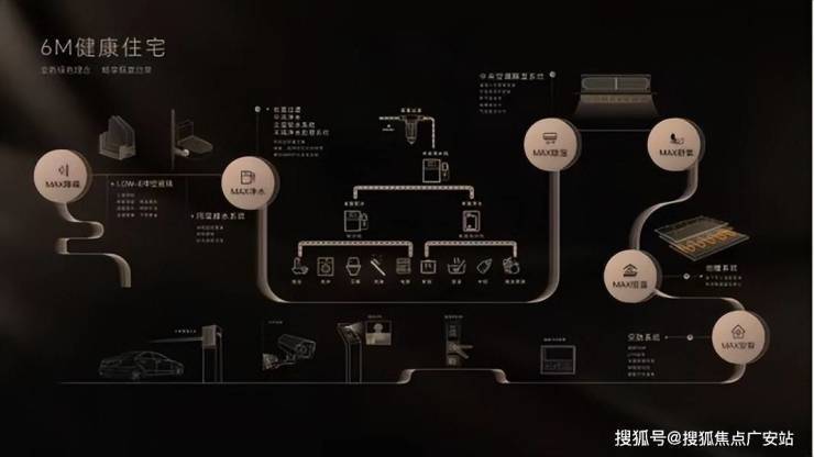 全屋配置6M健康智能住宅系统。这个智能系统系统涵盖降噪、净水、除湿、恒温、安智等多方面:
