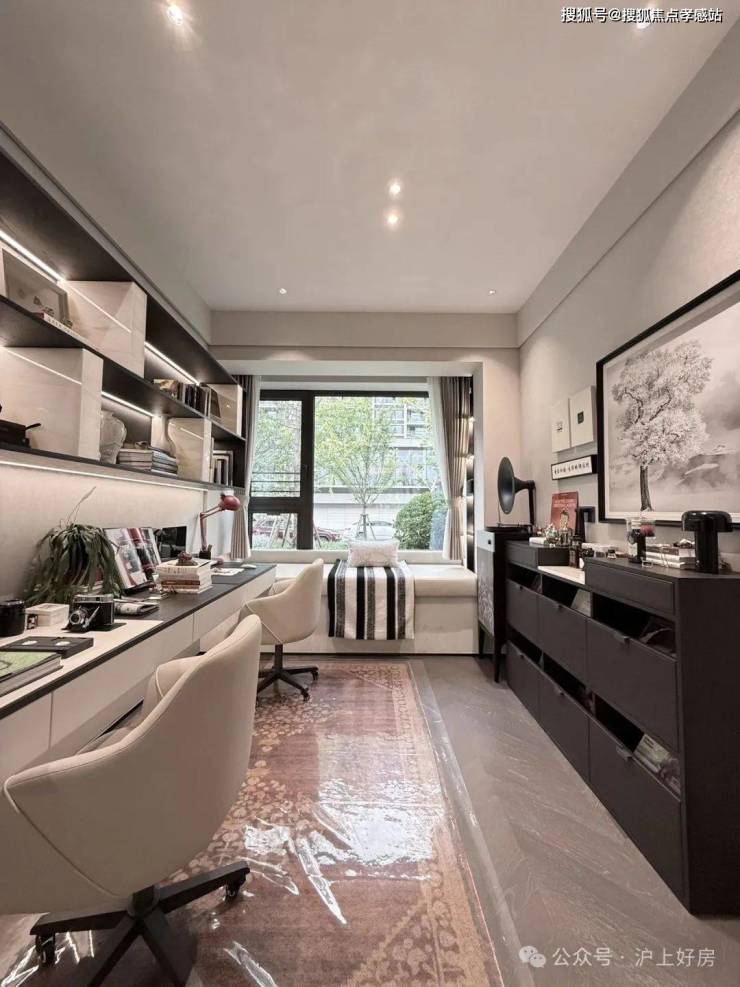 其中主卧的270°转角飘窗就有约5.7m²,通过与外立面的结合,直接做了梳妆台和储物柜,拓展了飘窗的实用性。