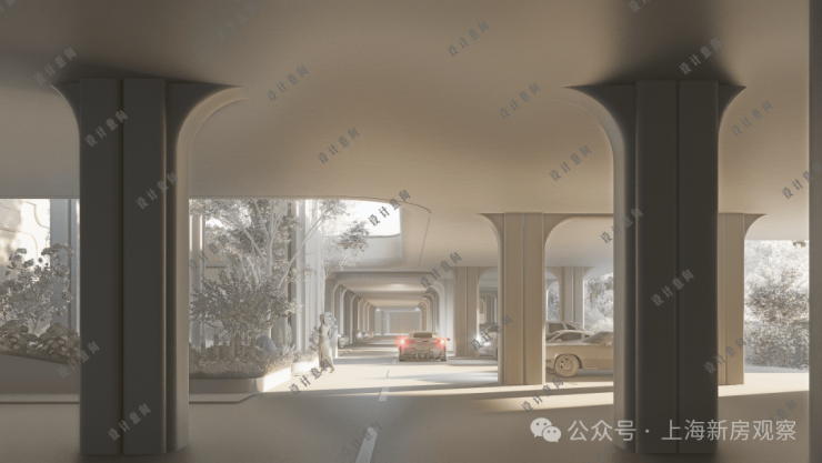 通过在首层设置结构转换层(抬板层),将整个住宅建筑主体抬升后优化车库流线:更充裕的空间便于设计更合理的车道、坡道和车位布局,提高停车效率。