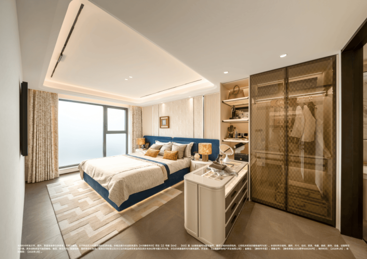 108户型主卧,连通阳台后,整体空间感媲美130㎡大三房的主卧尺度,在放置1.8米大床+双床头柜后,还能定制一个大尺寸L型衣柜。