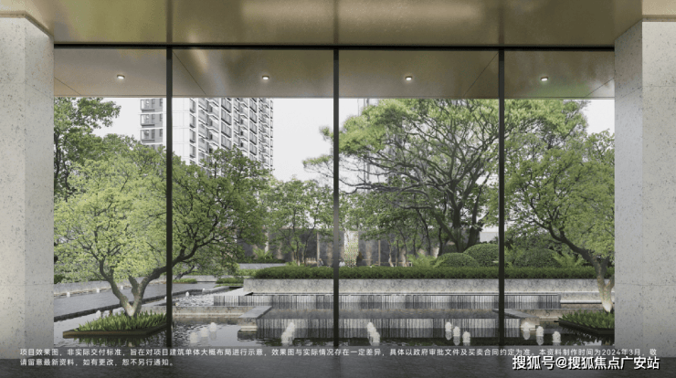 第一重——酒店式环道落客、现代精奢大堂、悬廊叠瀑水岸会客厅,移步异景,漫游归家入户;