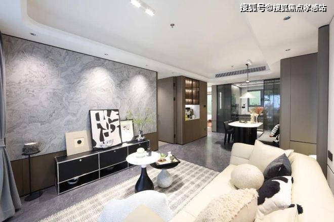 除了精装外,项目还有更多的品质感表现。例如客厅地面选用的是北京城建国誉府高定的温德姆灰大理石瓷砖;简一大尺寸瓷砖,拼缝仅0.35mm,工艺复杂,几乎无缝,整体性强