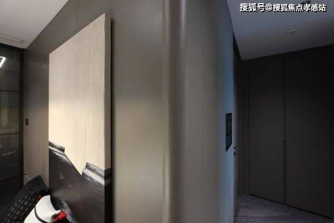主卧入户隐形门设计/客厅一体式背景墙/橱柜收口弧形木饰面处理;