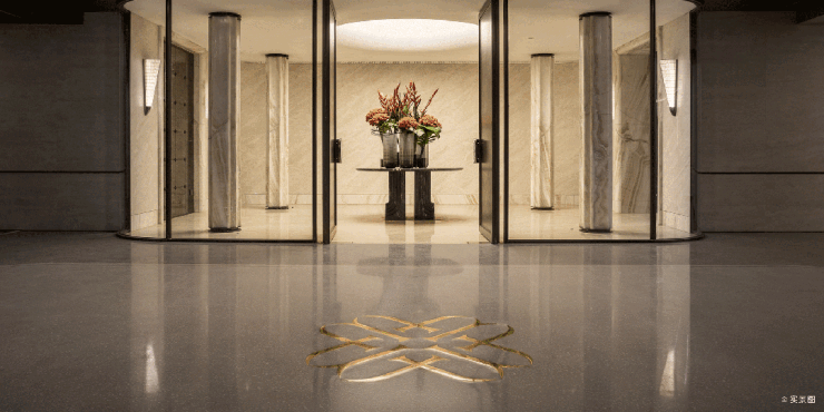 福鼎黑与安哥拉黑石材的精致拼花,与6米挑高的白玫瑰石材交相辉映。阵列景墙则是由铂金钻奢石打造,这是上海嘉佰道的同款,单方造价是常规石材的数倍!