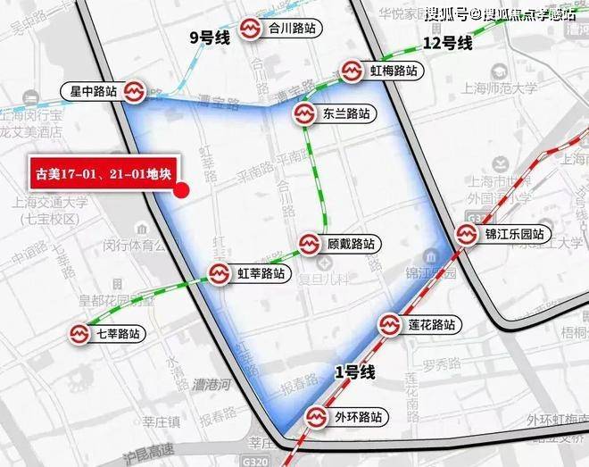 地块坐标古美板块西面,东至星中路、南至平南路、西至智联路、北至宝兰路,距离9号线星中路站、12号线虹莘路站直线距离约1.3公里。地块上游是金虹桥板块,下游则是莘庄。