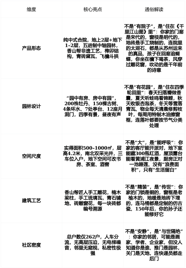 主力产品:建面176–667㎡纯中式合院别墅,实得面积500–1000㎡,得房率超300%