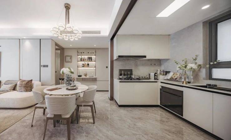 客餐厨一体化,既减少了过道的浪费;又打破了传统布局中的“隔阂”,几个功能区独立又互通,将空间功能进一步放大。