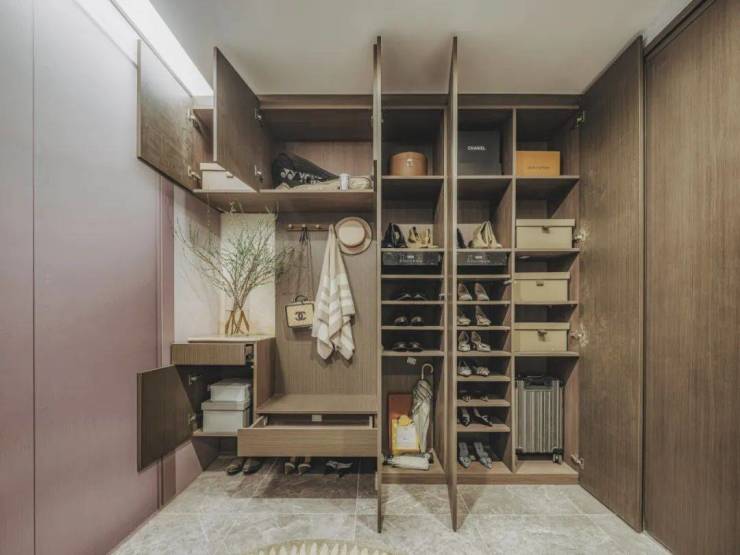 在后期合理利用下,可以增加多样功能,把家的玄关尺度,自然延伸到这个前厅,在家门口单独摆放一个进深约30cm、顶天立地的收纳柜,回家换下的鞋子、雨具、宠物用的牵引绳……都在家门口提前收纳整理。