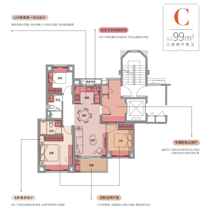 项目建面约88/99㎡3房户型几乎都做到了类一梯一户,享全明独立电梯厅。