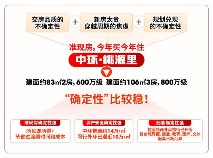 市场中能同时破解这三大难题的项目已属稀缺,而中环·桃源里,是当下”确定性“比较靠谱的楼盘。