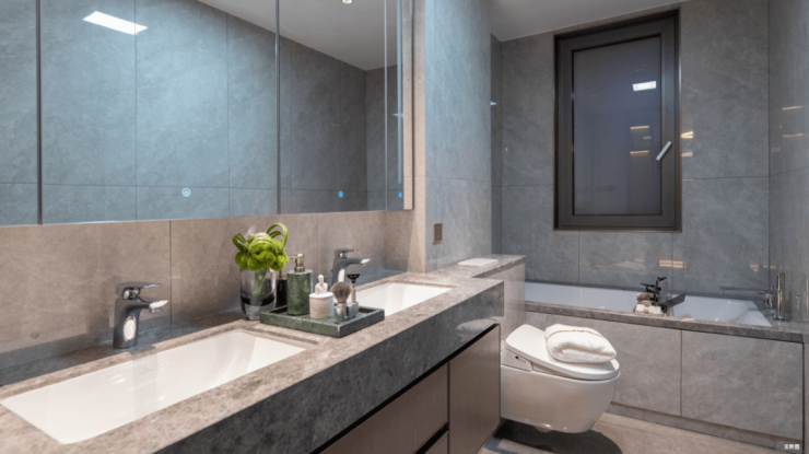五金系统选用诺托三玻两腔LOW-E系统化外窗,兼顾隔音隔热与美学质感;卫浴部件同样高阶,马桶台盆均为唯宝(主卫更是唯宝壁挂式马桶),龙头花洒则是科鲁迪;全屋还植入霍尼韦尔智能控制面板,可联动全屋设备,让科技无缝融入生活。