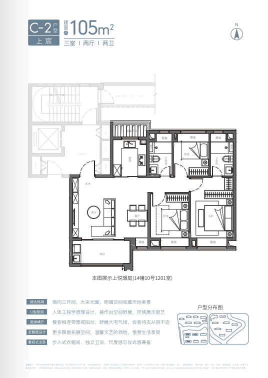值得一提,建面约129㎡4房是经典三卧朝南、边套观景户型。