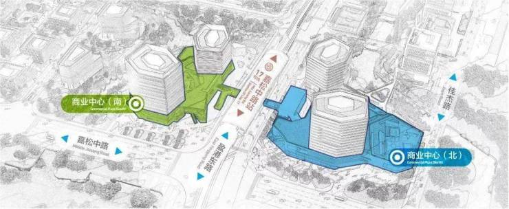 园区分南北区,南北两侧人行天桥直连轨交站台、办公及商业中心。