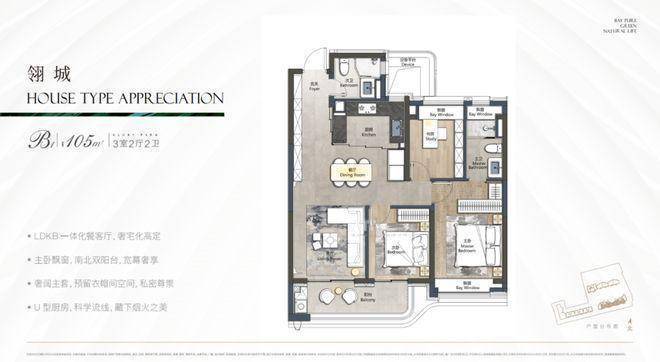 本次项目主推建面约105㎡3房2卫: