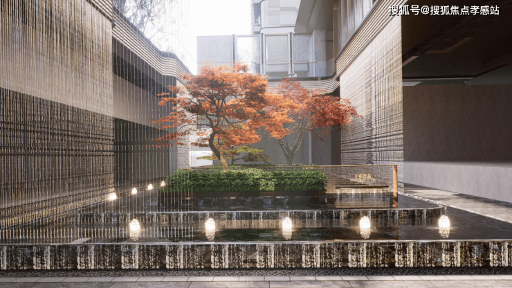 下沉庭院整体长约18米,进深约9.5米,庭院的上下景观通过水帘相连通,中间结合有着层层叠水的水景,搭配水晶砖的景墙,将品质感拉满。