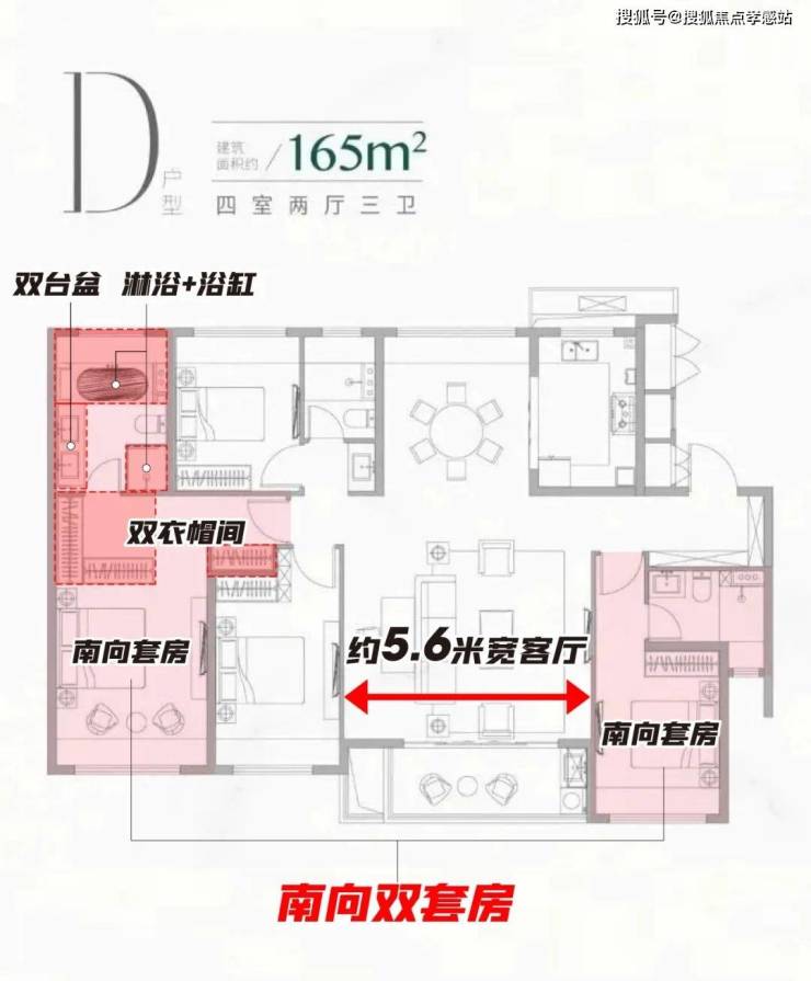 建面约165㎡4房为社区内的大户型,主要位于楼王位置,四开间朝南、南向双套房,主卫竟然还带双台盆设计+双衣帽间,男女主人都能拥有自己的衣帽间,妥妥豪宅配置。