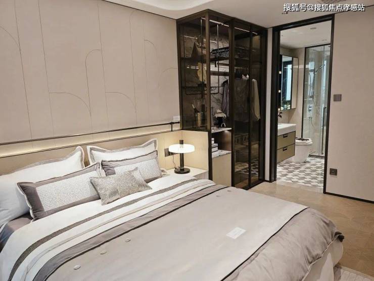 主卧套房设计,皮革造型的床背景墙也是交付标准,台盆为唯宝(或同等档次)、龙头则为科勒(或同等档次)复古龙头,马桶为高仪智能马桶(或同等档次)。