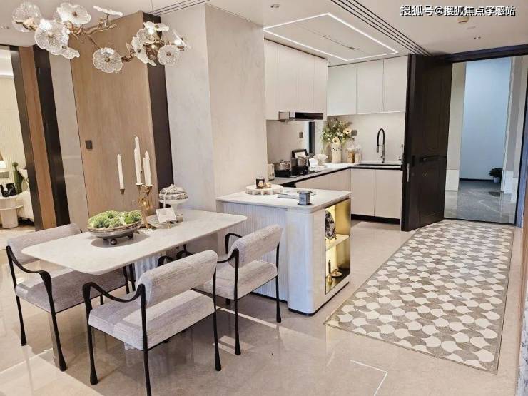 【海上清和玺】三期售楼处营销中心☎:400-8855-420✔✔进门可以看到经典的S墙设计,L型厨房操作台面,也是暗藏不少细节——玻璃移门采用完美系列夹丝玻璃+金属造型边框,顶部配置线性凉霸+LED嵌入式回形灯带+筒灯,灶台后侧采用大面积岩板铺设,方便清洁的同时显得厨房更加大气。