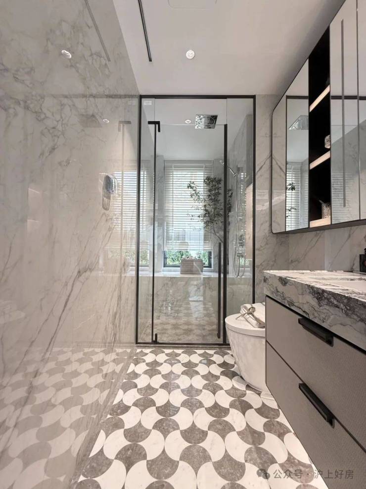 奢石台面,皮革饰面柜抽屉,侧端设置金属收纳开放格;定制镜柜,中间的透光玉石直接提升了高级感,镜柜内部配备了美妆冰箱+美妆灯条+轨道收纳!