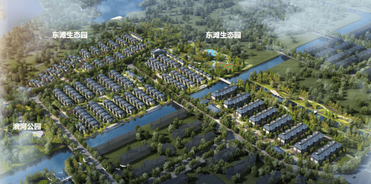 东北两面有东滩生态园,西面是滨河公园,周边水光灵动,归野自然。