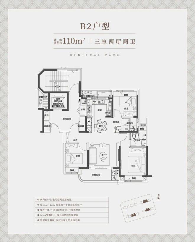 建面约110㎡中间套竖厅户型,同样也是标准的南北通透飞机户型,整体室内的采光、尺度感、通风都相当出色。非常适合一家三口、年轻夫妻的全生命周期需求!