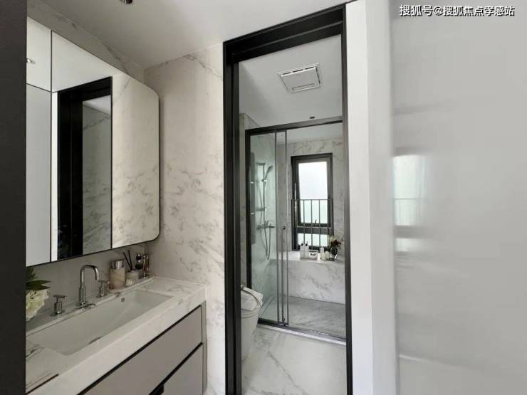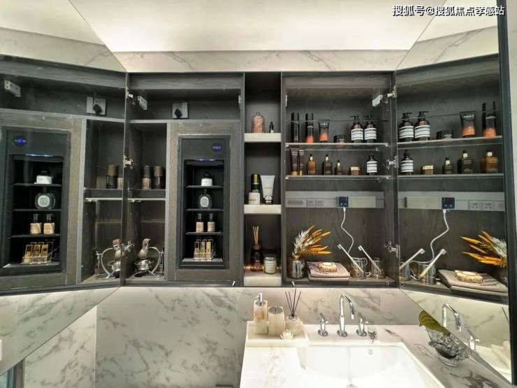 ✨招商中旅观境官方售楼处☎☎:400-8787-740👈✨双卫配置,其中一个做了干湿分离,科勒台盆+双智能马桶+高仪花洒,除雾镜柜均内置了牙刷消毒器、预留吹风机插座。主卫镜柜还有美妆冰箱,收纳空间相当充足。