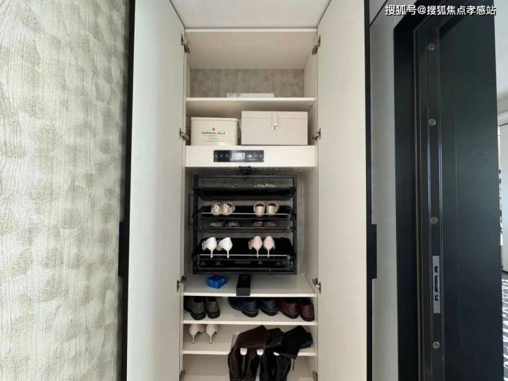 入户门是是非常有质感的铸铝门,带电子猫眼智能门锁;进门后是一个独立玄关,木纹玄关背景墙,右侧是通顶的悬浮玄关柜,内置鞋柜精灵和抽拉鞋架。✨招商中旅观境官方售楼处☎☎:400-8787-740👈✨