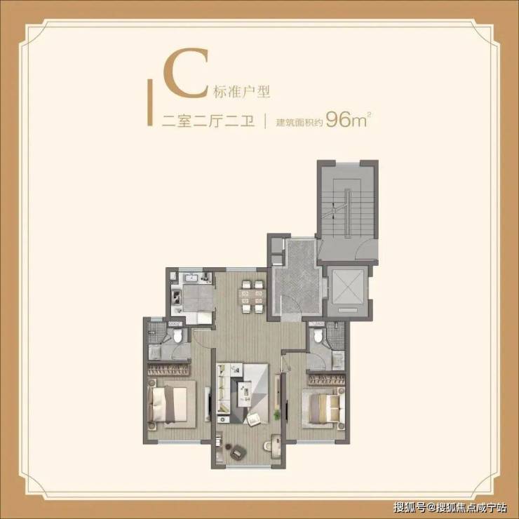 建面约96㎡2房,做到了三开间朝南的飞机户型,几乎没有走道空间浪费,2个卫生间也满足了家庭生活场景需求。
