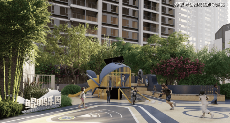 以“鲲鹏乐园”主题儿童乐园、鲲鹏书院、老人颐乐空间、多元艺术花园、约760m“汽车文化”主题跑道、森林漫步道等共享场域为居者构筑一个有温度的社区。