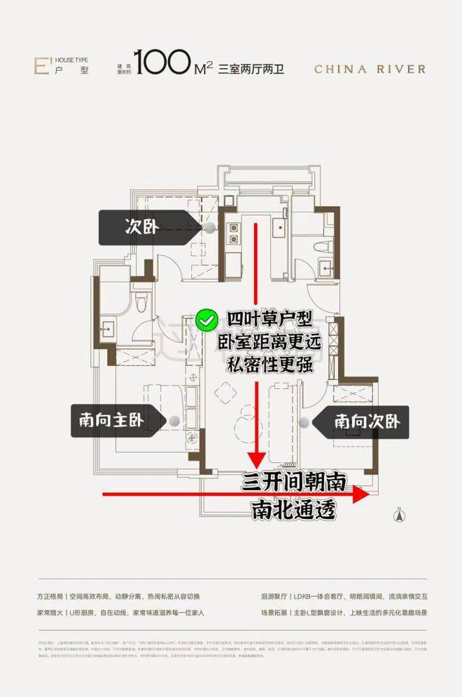 建面约100㎡3房,采用同级罕见的四叶草布局,三个房间距离较远,互不打扰,充分满足当代都市人对个人生活空间的需求。
