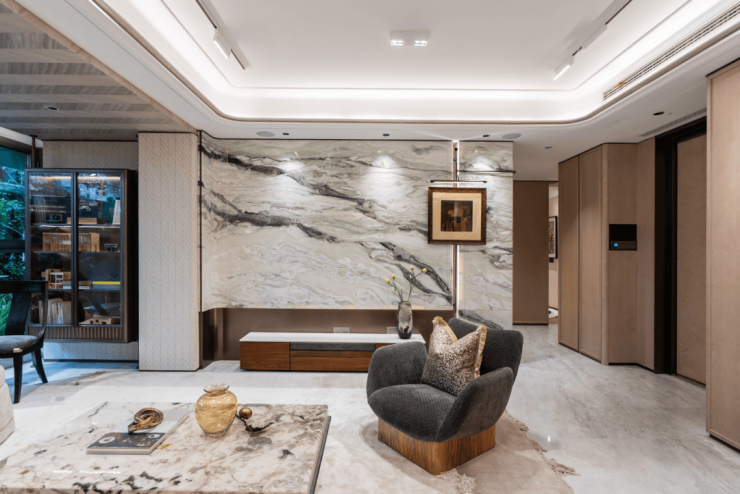 入户做了精致玄关柜,柜门为温润木饰面包裹,壁龛选用奢石映衬,质感非常棒。