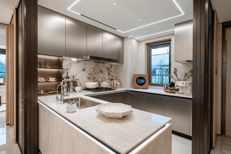 比如说餐边柜+操作台+洗手台一体化设置,让这个空间不再单独的满足于简单的吃饭、客厅休憩。