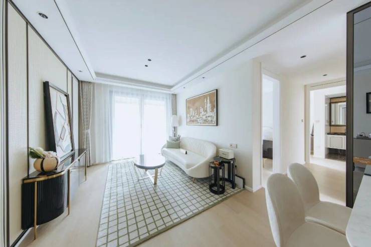 客厅三开间朝南,方正格局,功能区域分布清晰,动线灵活,没有廊道空间的浪费,充分利用每一寸室内空间。