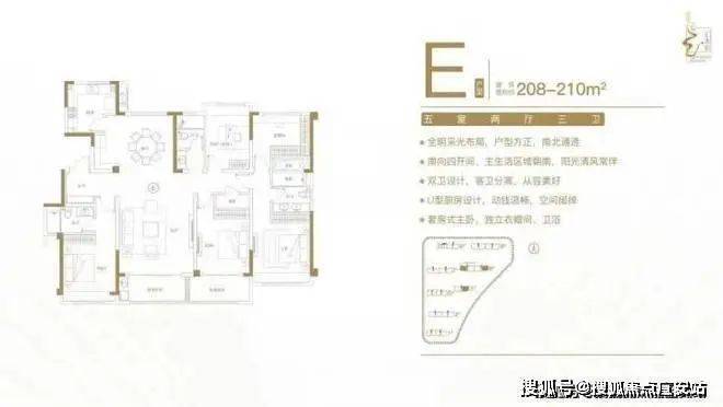 佳运汇龙府预约热线☎:400-8080-420✅✅约208-210㎡五室两厅三卫户型特点:全明采光布局,户型方正,南北通透;南向四开间,主生活区域朝南,阳光清风常伴;双卫设计,客卫分离,从容美好;U型厨房设计,动线流畅,空间阔绰;套房式主卧,独立衣帽间、卫浴。