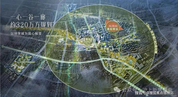 以环宇城为圆心蜕变1.5km圈,围绕“一心一谷一廊” 规划。一心-真如之心、一廊-真如绿廊、一谷-真如翠谷。