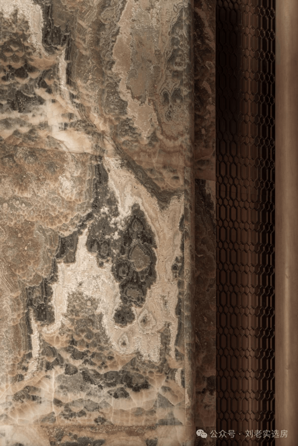 顶部定制发光云石亚克力与圆弧形的古铜色铝板交相辉映,8个西班牙宫殿沉香米黄石柱提升了尊崇感 ,漫步其间,揽风入怀,树影斑驳映入眼帘,水声潺潺入耳,归家的轻松感油然而生,笔者随手一拍,都非常的出圈。