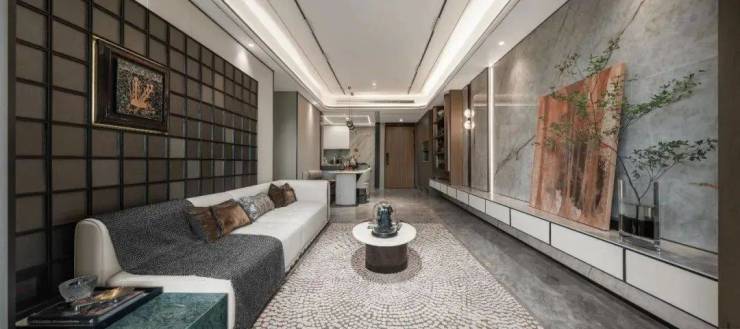 再比如墙面,该样板房的电视背景板融入了整块玉石作为背景墙,典雅庄重,体现了业主的不凡品位,这种大手笔一般在千万级豪宅项目上才能看到。