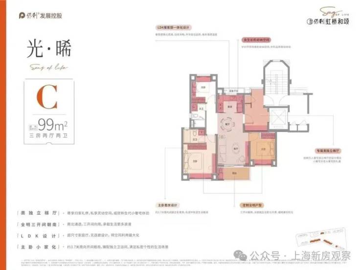 「保利虹桥和颂售楼处电话:400-1010-064☎☎」建面约99㎡3房2卫户型不仅保留三开间朝南和餐客厅一体化的优势,更在尺度上大踏步进阶。主卧面宽高达约3.7米,客厅面宽高达约3.75米,适配有尺度改善需求的客户,而市面上同面积段产品尺度基本为客厅面宽约3.5米,主卧约3.3米。