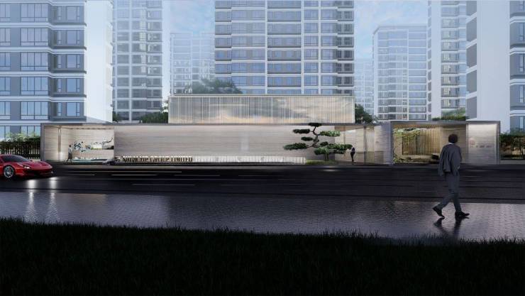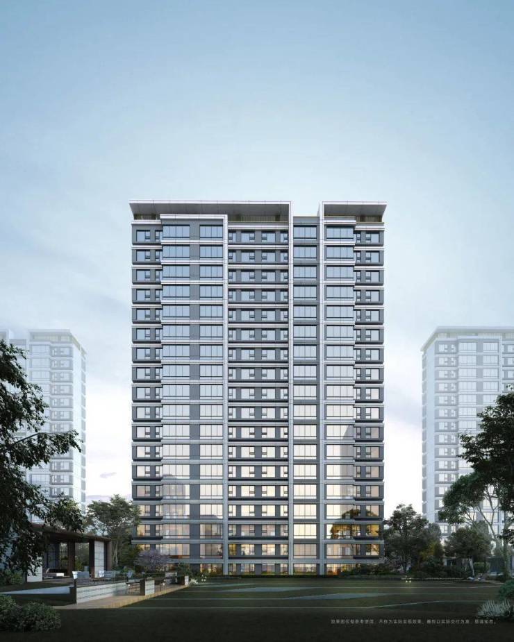 建筑立面,「深业·深安上居」整体以简约风格的线条,搭配玻璃和米白及深灰色的材质涂装,营造出光影般颜值框架的同时,让建筑成为区域内历久弥新的品质标杆。