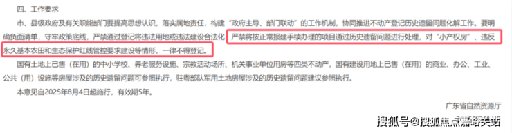 而过去《广东省自然资源厅关于印发加快处理不动产登记历史遗留问题指导意见的通知》(粤自然资规字〔2018〕5号)只针对“不符合法律法规规定的小产权房”,但新的指导意见,将严禁的问题放在了“工作要求”的部分。