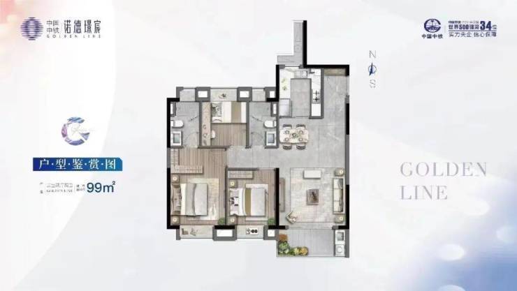 中铁诺德•璟宸有三种户型:约89平的三房两卫,约99平的三房两卫,和约129平的四房两卫。