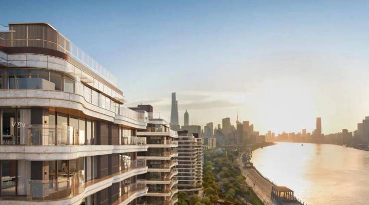 约270°蝶形阳台呼应江水曲线,波浪形立面与金属包边设计,将黄浦江流动感融入建筑;
