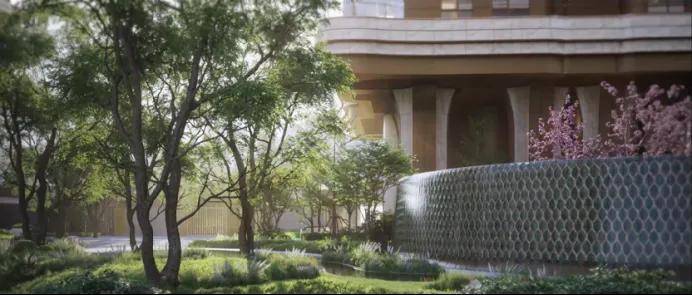 地面铺装采用祖母绿切面工艺,水景如蓝宝石晶莹,侧立面格栅呈现琥珀质感,细节彰显奢华,种植100余种名贵植物,四季风貌更迭。