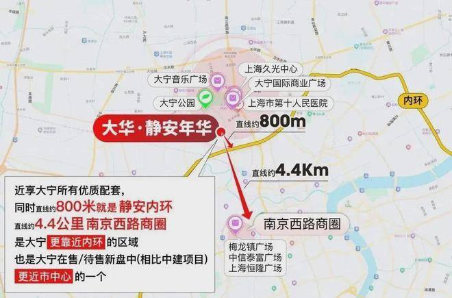 【大华·静安年华】项目可谓双王炸区位,直线800米贴脸静安内环,一脚油门就能杀进上海城市动脉,畅达全市核心节点;约4.4公里直插静安寺-南京西路心脏,直接把全上海顶流的繁华,变成你家的「日常生活」。