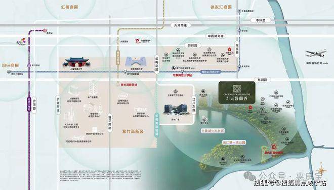 同时结合公园城市理念,嵌入文化、体育、商业、酒店等功能节点,力求打造多元融合的兰香湖生态社区。地块所在的紫竹区域占据浦江上游第一湾独特地理位置,核心区域有闵行第一大湖兰香湖,水域面积广阔,岸线绵延,湖光潋滟。