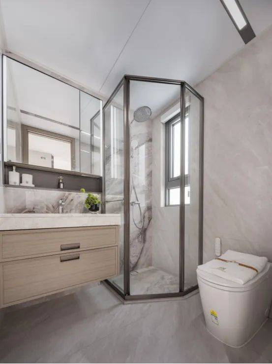 家的巨量收纳卫浴:主卫生间配备了智能化的魔镜,该镜面为双面高清设计,内置美妆冰箱功能的镜柜以及卫浴柜,能够实现恒温冷藏。主墙面装饰采用了耐用的岩板材料,内部设计考虑周到,特别预留了四个电源插座,方便电动牙刷、卷发棒以及吹风机等个人护理电器的使用和收纳,同时设有洗脸巾的抽取装置。
