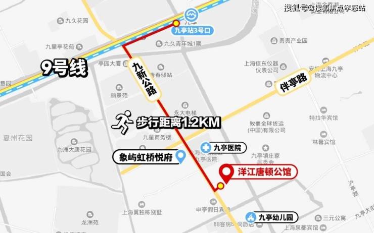 交通方面:洋江·唐顿公馆直线距离九亭站约800米,实测步行约1.2公里,是当下离地铁站较近的新盘。